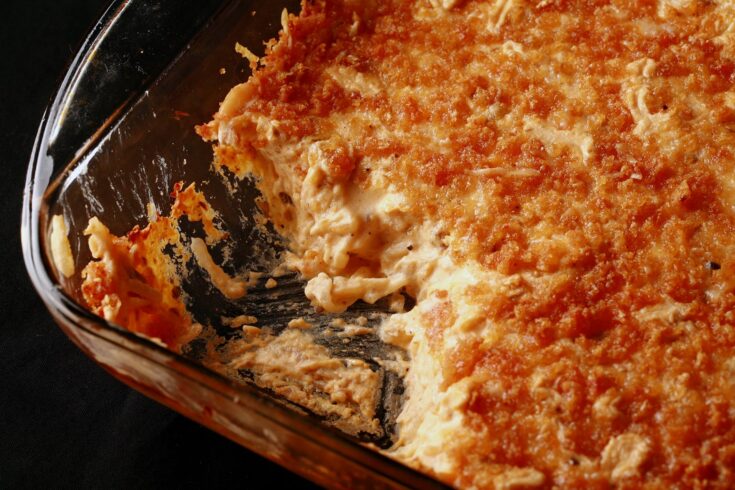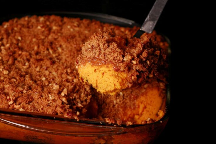 • A pan of sweet potato souffle with a scoop of it being spooned out.