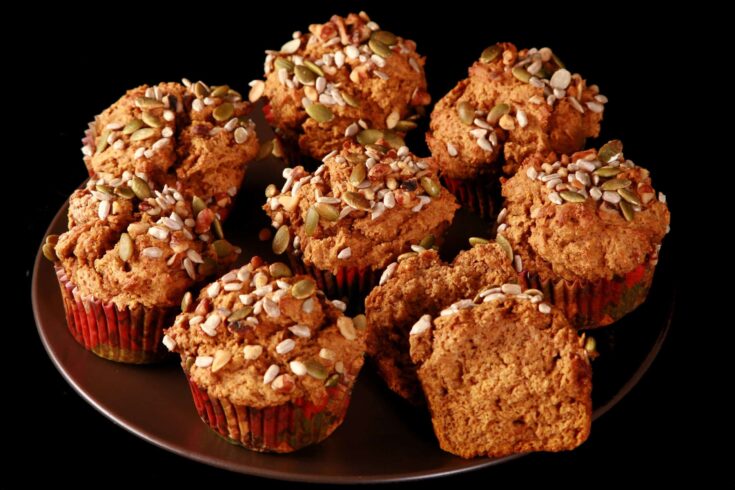 • A plate of gluten-free pumpkin muffins, all topped with a mix of seeds and nuts.
