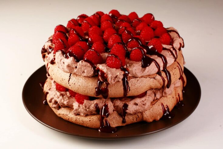 This Chocolate Raspberry Pavlova is a stunner! It’s a double decker, triple chocolate (meringue, whipped cream, and sauce) pavlova.